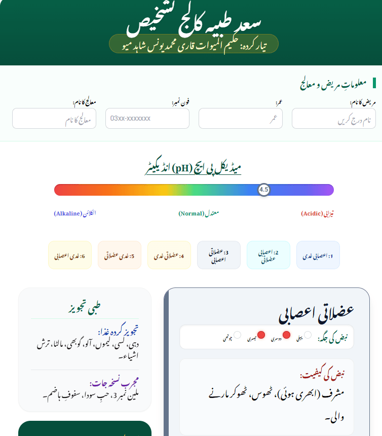 جامیں نبض۔قارورہ یعنی یورن ٹیسٹ ۔غذا۔خوراک۔پرہیز۔عمومی طورپے جن چیزن کی علاج و معالجہ میںضرورت پڑے ہے۔