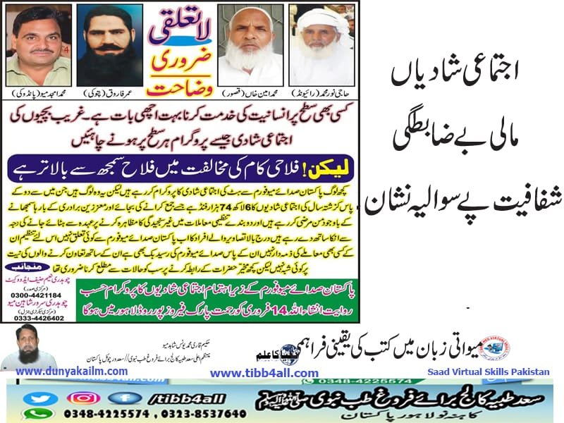 پاکستان صدائے میو فورم کے زیر اہتمام اجتماعی شادیوں کا پروگرام حسب روایت انشاء اللہ 14 فروری کو رحمت پارک فیروز پور روڈ لاہور میں ہو گا۔