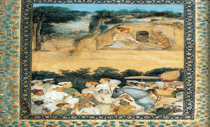 Mughal miniature painting depicting a historical scene with courtiers and royalty in a natural setting, illustrating the artistic style of Mughal manuscript illustrations.