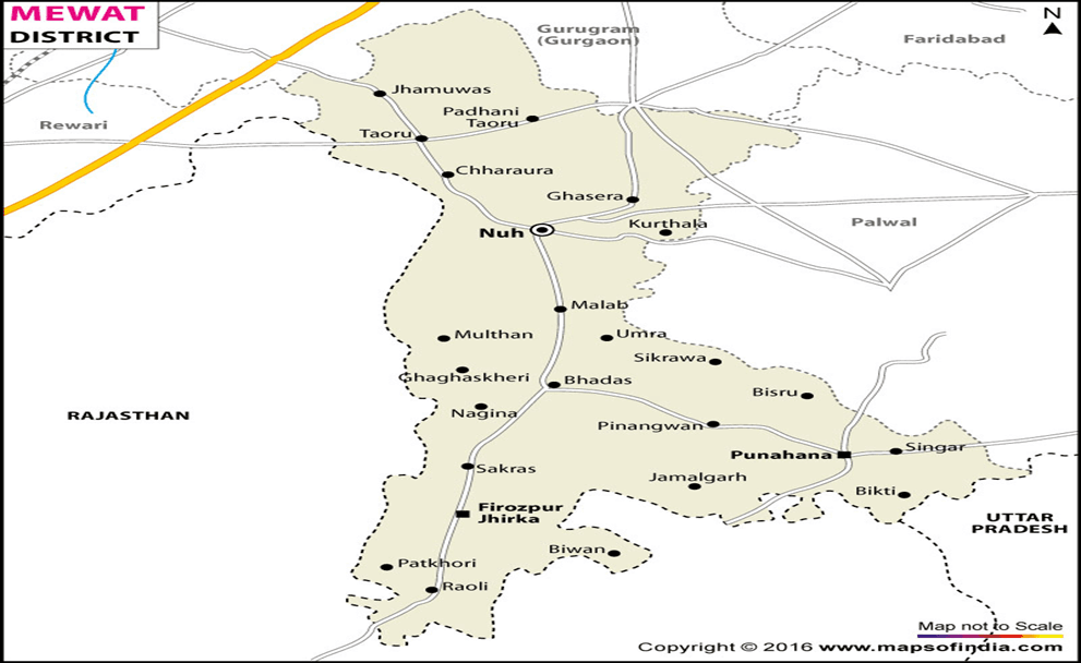 Map of Mewat district showing key towns and villages relevant to its historical significance during the Mughal era.