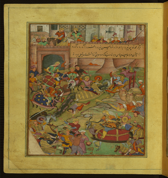 Miniature painting from Baburnama manuscript depicting a battle scene illustrating Mughal military campaigns and regional resistance in the Mewat area.