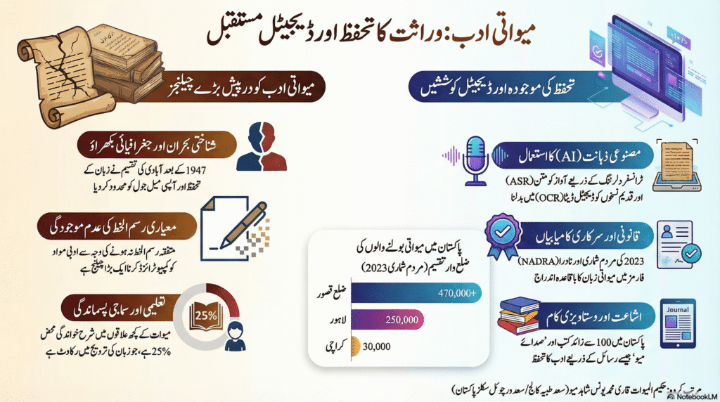 1947 کی تقسیم نے میواتی ادب کو بھی دو حصوں میں بانٹ دیا ہے۔ ہندوستان میں قدیم زبانی روایات اور صوتی ریکارڈنگز کا بڑا ذخیرہ موجود ہے، جیسے روپاین سنستھان جودھپور کے آرکائیوز 7۔ دوسری طرف، پاکستان میں میواتی زبان کو قومی شناخت دلوانے اور تحریری ادب پیدا کرنے پر زیادہ کام ہو رہا ہے 2۔ ان دونوں خطوں کے محققین کے درمیان تعاون کی کمی کی وجہ سے ایک ادھوری تصویر سامنے آتی ہے۔ جب تک صوتی ذخائر اور تحریری مواد کو یکجا نہیں کیا جاتا، میواتی ادب کی جامع تدوین ممکن نہیں ہے۔