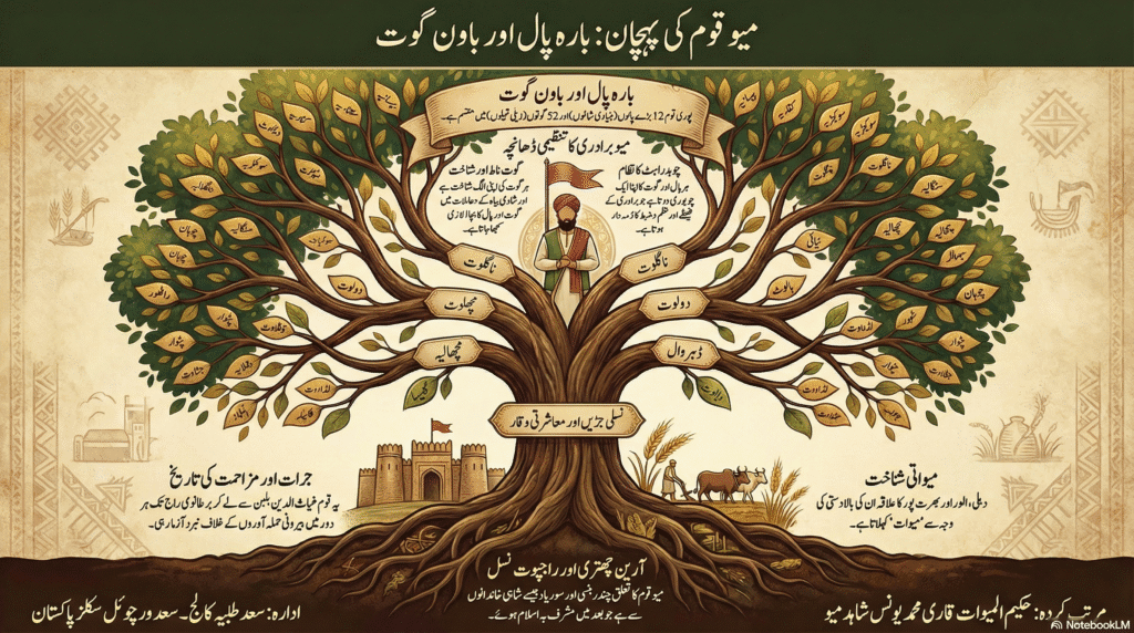 برصغیر پاک و ہند کی انسانی تاریخ میں میو قوم ایک ایسی اکائی کے طور پر ابھری ہے جس کی جڑیں قدیم ہندوستان کے سماجی ڈھانچے اور اسلامی تہذیب کے ملاپ سے استوار ہوئی ہیں۔ میو، جنہیں میواتی بھی کہا جاتا ہے، بنیادی طور پر شمالی مغربی ہندوستان کے خطہ “میوات” سے تعلق رکھتے ہیں، جو موجودہ ہریانہ کے ضلع نوح (گڑگاؤں)، راجستھان کے اضلاع الور اور بھرت پور، اور اتر پردیش کے کچھ حصوں پر مشتمل ہے 1۔ میو قوم کی شناخت کا سب سے اہم پہلو ان کا “نات گوت” کا نظام ہے، جو ان کی نسلی پاکیزگی، سماجی تنظیم اور شادی بیاہ کے ضوابط کو کنٹرول کرتا ہے۔ یہ نظام بارہ “پالوں” اور باون “گوتوں” پر مبنی ہے، جو تیرہویں صدی میں رانا کاکو بالوت میو کے دور میں باقاعدہ طور پر مرتب کیا گیا تھا 1۔ میو قوم کی یہ سماجی ساخت انہیں دیگر مسلم گروہوں سے ممتاز کرتی ہے کیونکہ انہوں نے اسلام قبول کرنے کے صدیوں بعد بھی اپنے قدیم ہندو راجپوت اور چھتری رسم و رواج، خاص طور پر نسب ناموں اور خاندانی تنظیم کو برقرار رکھا ہے 3۔